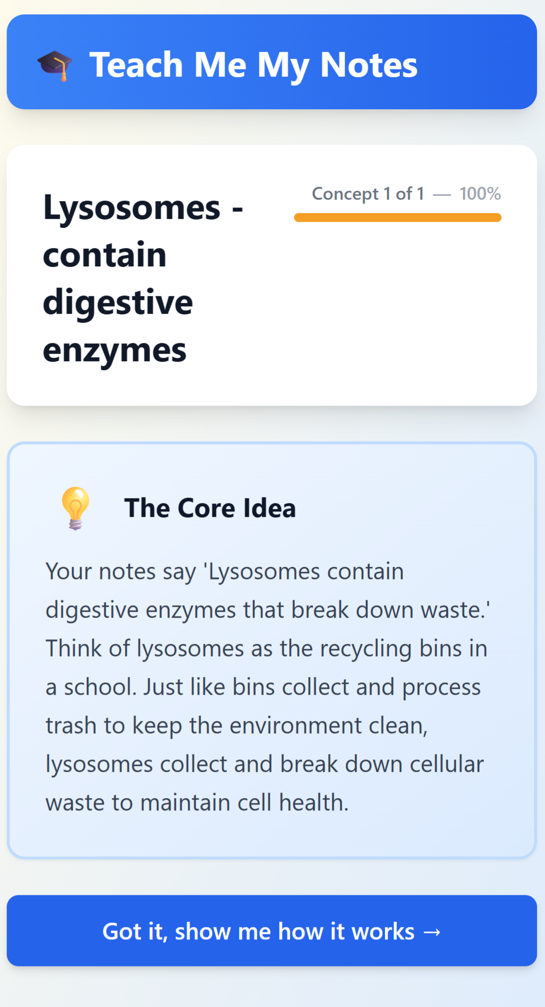 Students learn best when they understand concepts first, then test themselves. That's why we guide you through learning with Teach Me My Notes mode, then reinforce it with quizzes, flashcards, and study guides.
